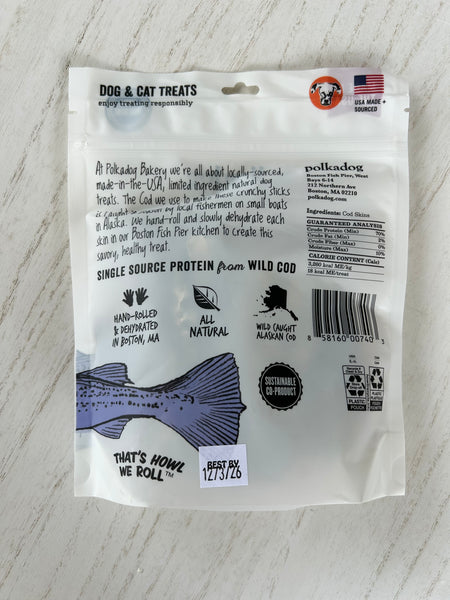 One ingredient treat full of protein! Wild caught Alaskan cod that is hand rolled and dehydrated.